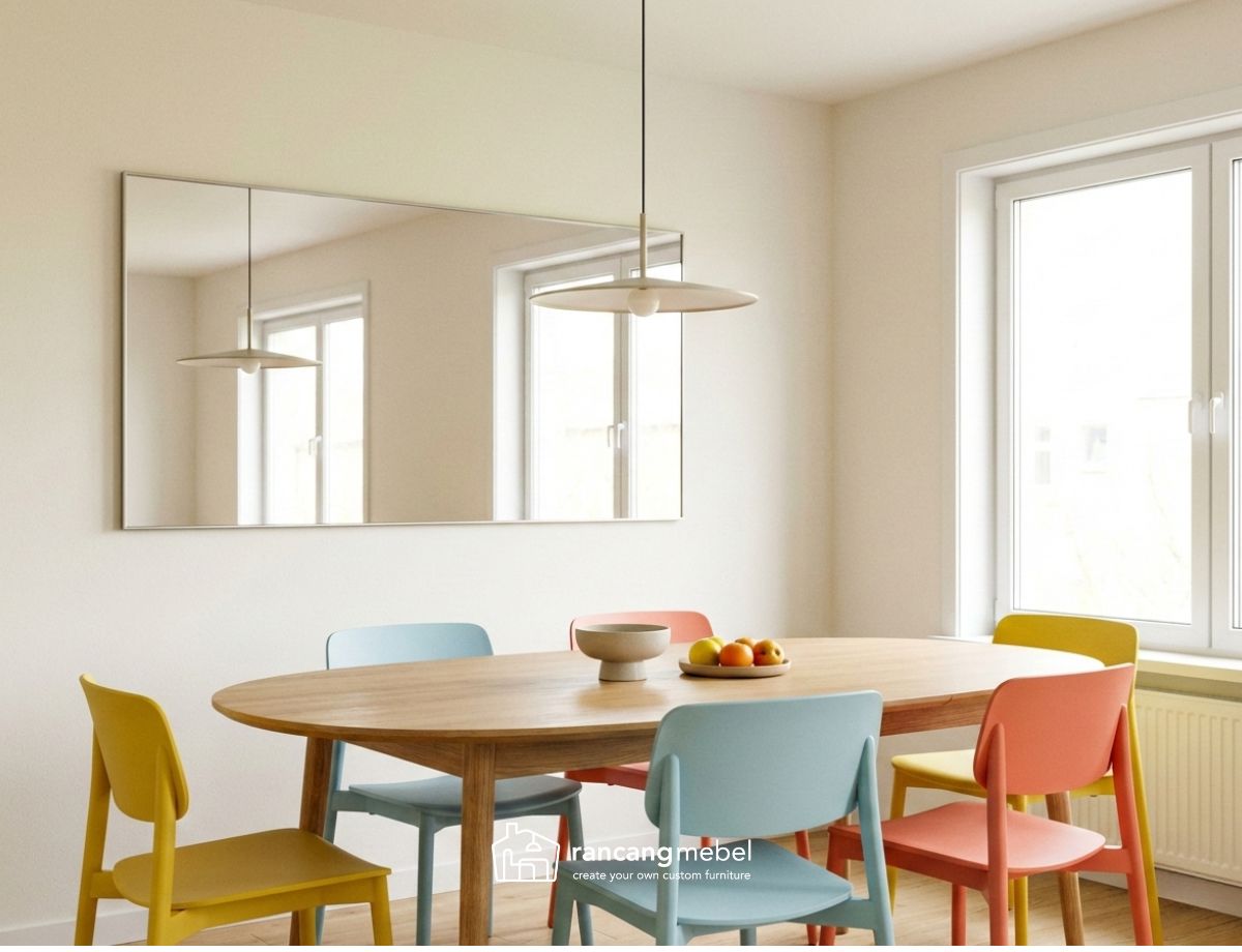 Cermin adalah trik klasik interior untuk ruang kecil. Pantulan cermin bisa membuat ruang makan tampak dua kali lebih luas dan terkesan lebih terang. Sobat bisa pilih cermin dengan tema minimalis dengan frame tipis sehingga tidak memberikan kesan bulky dan sempit.